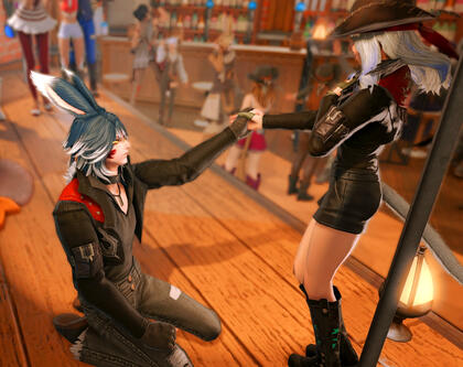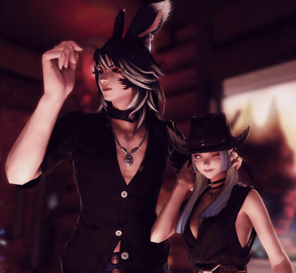 Every single day Lea was out playing, Illy would stop by and converse, commenting on how his songs were so beautiful, and how he could command such attention as to make others stop and listen along. From bright of day to dark of night, even in the pouring rains Gridania is so well known for, she was there, listening. He came to look forward to seeing her stop, as at the time, she was one of his best fans.After some time, and on a rather rainy evening, he invited her to come visit his favorite place to spend an evening, the Kitty Twister, an authentic honkytonk right here in the middle of Eorzea. A friend, Sakata, had introduced him to this place and the notion of a 'honky tonk' (Of which he always pronounced incorrectly). Illy's first night there was memorable for them both, as they bonded over a love of lavender vodka, of which Lea enjoyed, and then regretted the next morning.To his surprise, she sent him a message on his tomestone asking when he were next going, for she wanted to come with again. He told her there was a local spa, Elysian, he frequented, and offered for her to come along. She happily accepted. There, they spoke of their lives, their thoughts, their hopes and dreams.They visited several venues together after this, enjoying one another's company, until Lea finally garnered the courage to ask Illy on a true and proper date. She laughed, and asked what the other times they visited venues were. Shocked, Lea blubbered and realized he hadn't planned on her saying yes, which only made her laugh more.